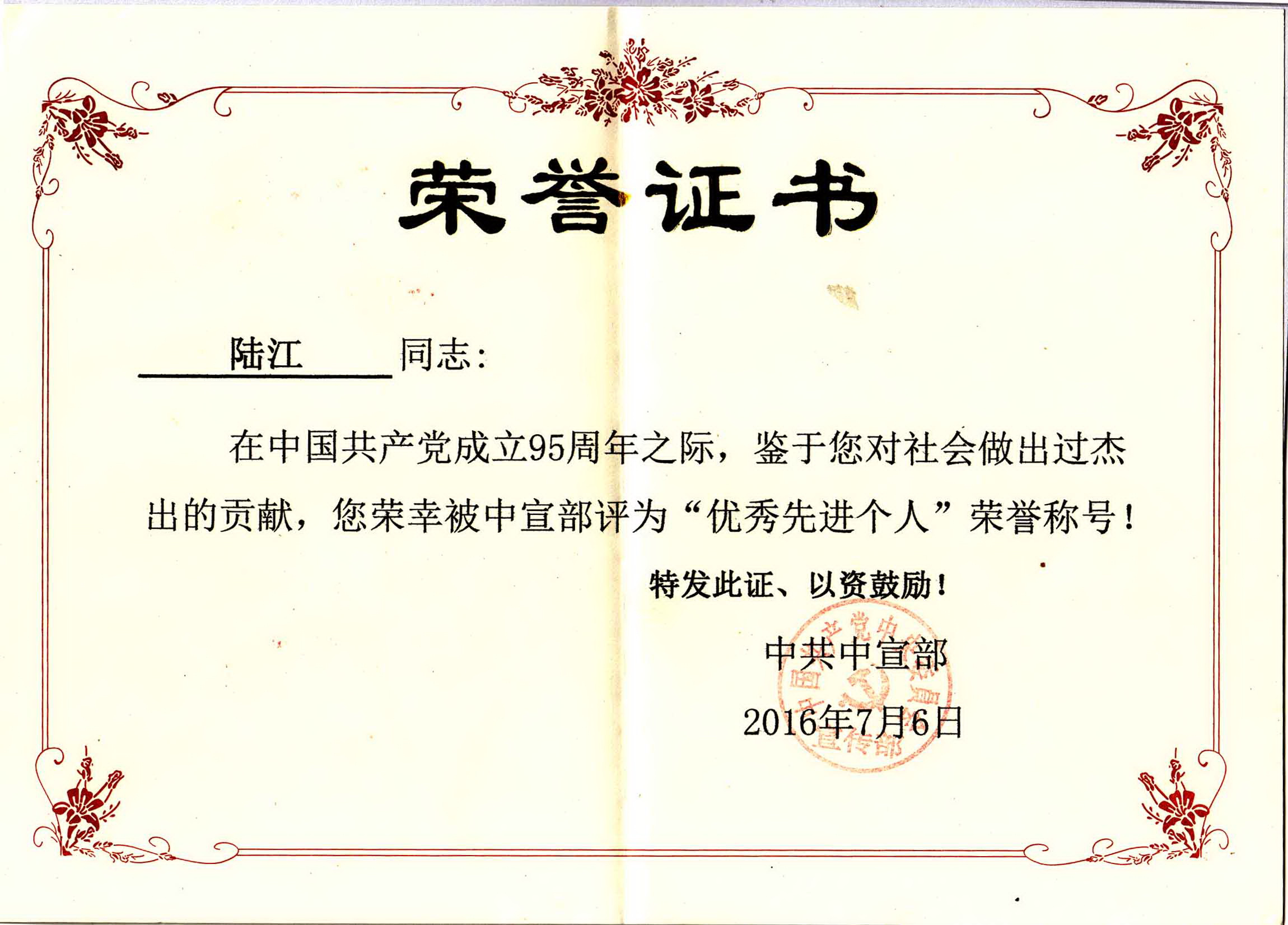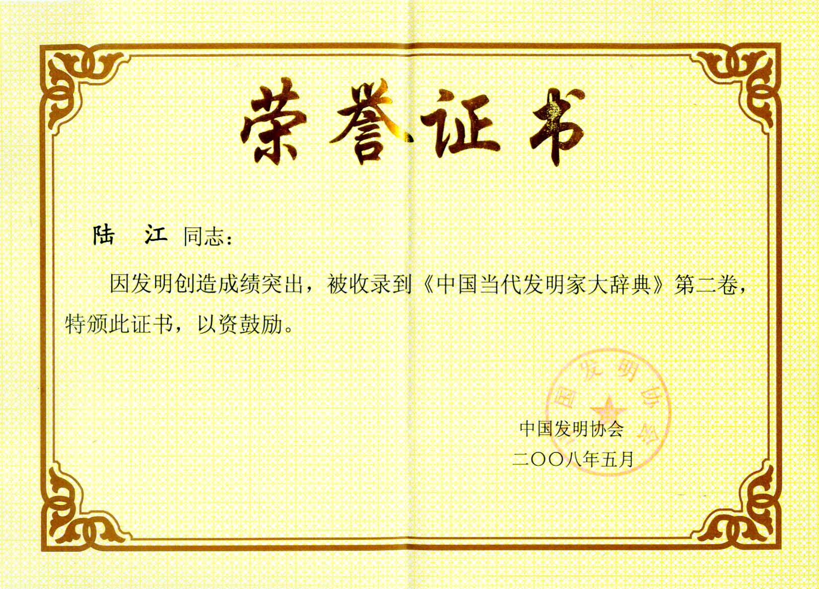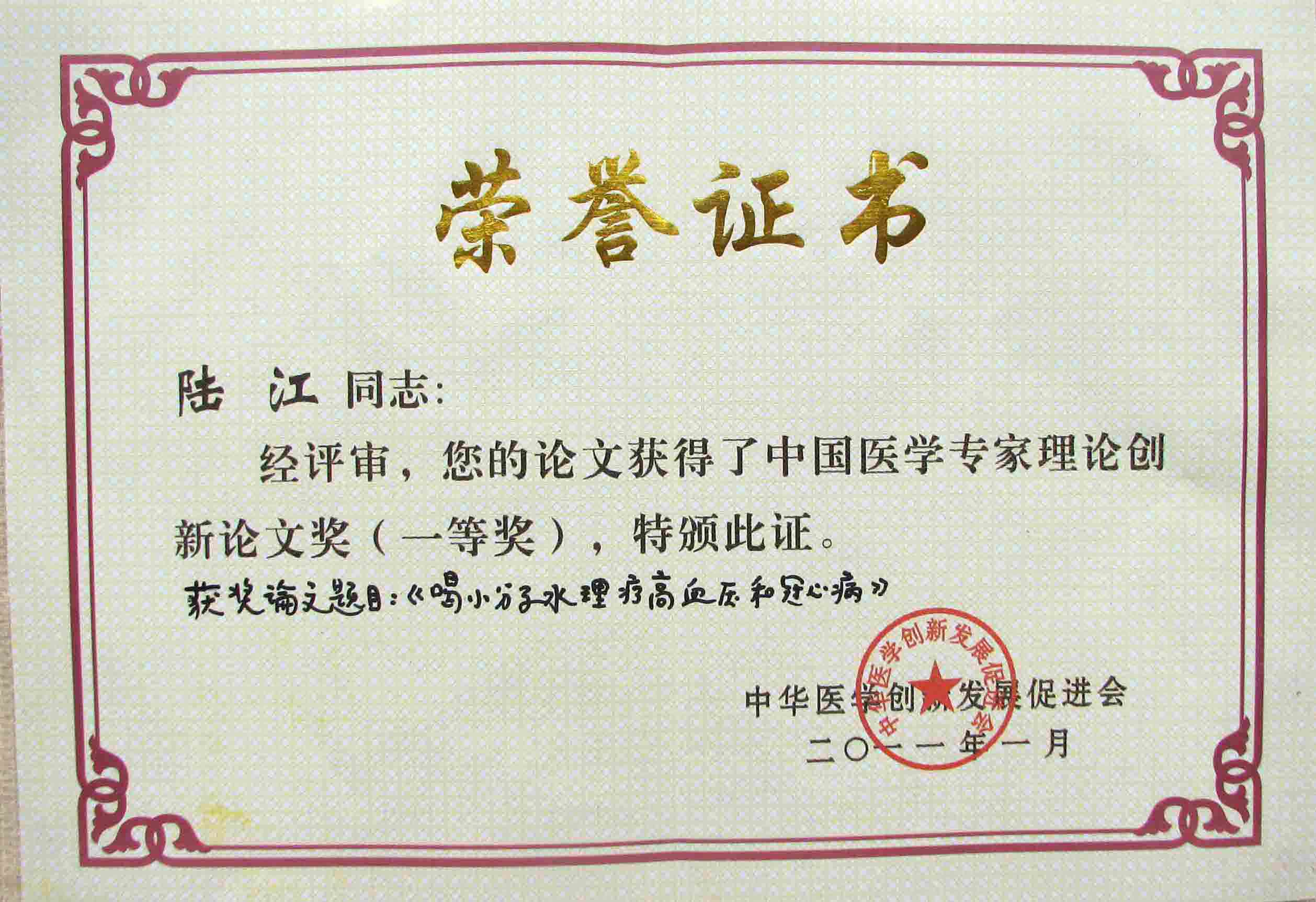 陸江的論文獲一等獎榮譽證書-- 陸江論文獲創(chuàng)新論文獎牌