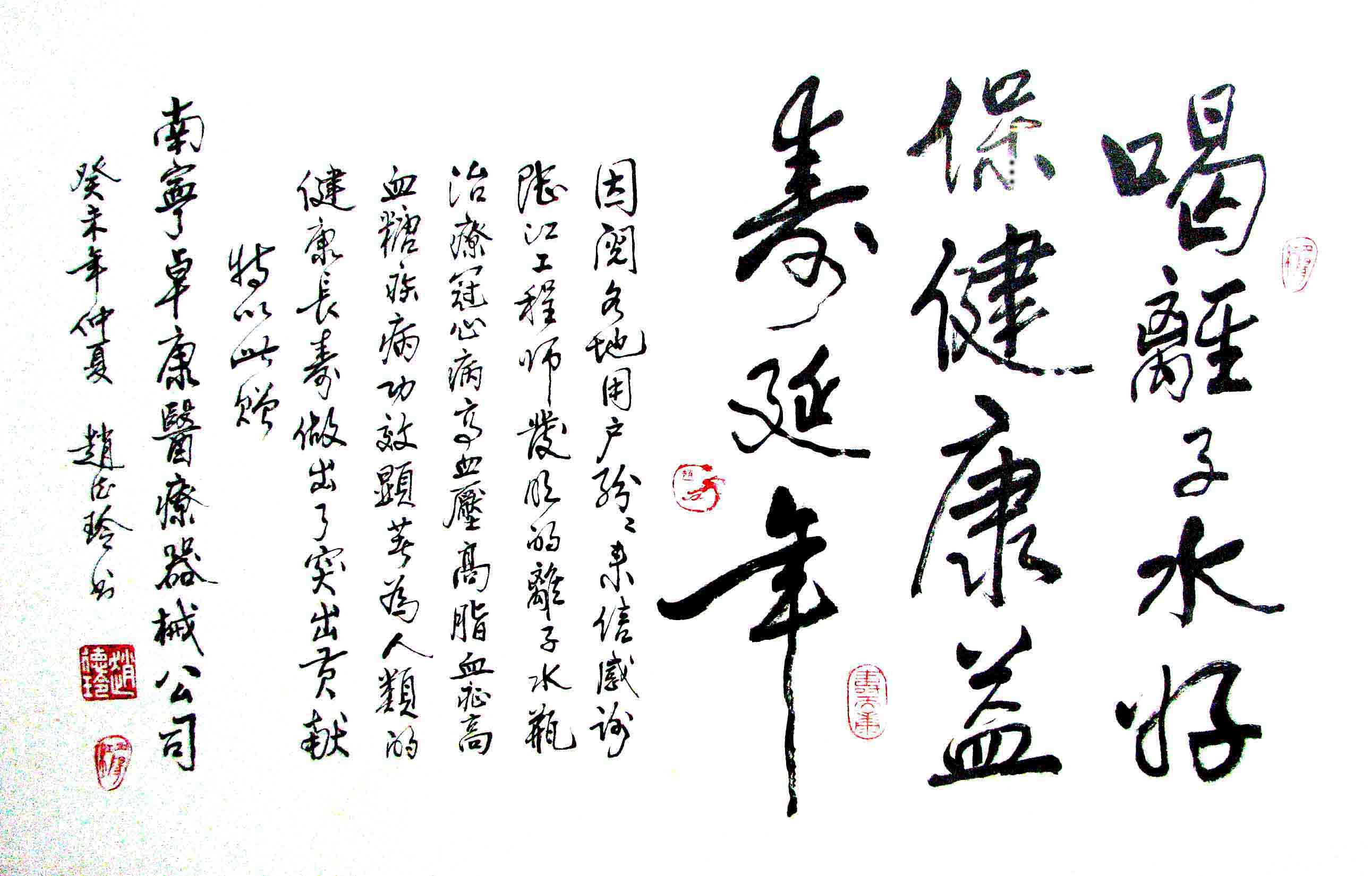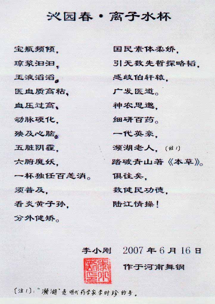 -----我是從事建筑的高工,本來沒有資格去攻克醫(yī)學難題,卻為了自身健康才扣響醫(yī)學的大門。由于我1990年患高血壓,因怕中風才研究發(fā)明了離子水瓶,我把水處理成微小分子團水,飲用后治愈了高血壓。便于1993年底送到三家省級醫(yī)院做臨床試用4個月。經(jīng)北京和廣西醫(yī)學專家鑒定:"降脂降壓效果好"," 能擴大心腦動脈流量,改善心腦電圖以及微循環(huán)","對治療心腦動脈粥樣硬化、高血壓、高血脂有良好的醫(yī)療保健作用。""產(chǎn)品的技術性能和療效達到了同類產(chǎn)品的國內領先水平,經(jīng)廣西醫(yī)學科學情報研究所檢索,未見國外有類似報道。"中國醫(yī)學科學院張正國教授從美國國立醫(yī)學圖書館數(shù)據(jù)庫存Medline檢索英俄文資料,均未見類似報告。2000年上市后,我為了對消費者負責而繼續(xù)觀察研究,一直通過《信譽卡》和《質量跟蹤調查書》向患者承諾療效,請用戶使用6個月后反饋效果。和脂壓患者飲用2至5個月內,消除癥狀,停服藥物,血壓正常;冠心病患者飲用3~5個月逐漸減輕至消除心絞痛、房顫等癥狀,不再服藥,飲用1年左右心電圖正常,經(jīng)冠脈造影掃描無明顯狹窄,表明冠心病痊愈。大量患者還反映許多衰弱器官被修復,讓前列腺增生、慢性咽喉炎、慢性氣管炎、支氣管炎、慢性胃炎、腸炎和膽囊炎等不藥而愈;2型糖尿病患者是因為胰島衰弱致病,飲用該水半年至一年,逐漸減藥至停藥,血糖尿糖正常,真正治愈2型糖尿病。中風后遺癥患者飲用六七個月,可逐漸減輕至消除肢體和語言障礙,表明飲用該水能讓壽命很長的神經(jīng)元細胞逐漸修復,奇跡般地恢復肢體和語言功能。飲用后還使胸腺和脾臟兩個重要的免疫器官被修復和增強,產(chǎn)生免疫細胞多,提高了免疫力,使人不生病或少生病。自此, 飲用微小分子團水創(chuàng)造了攻克冠心病、高(低)血壓和糖尿病三大醫(yī)學難題的奇跡。人們對此感到不可思議,但實踐是檢驗真理的唯一標準。