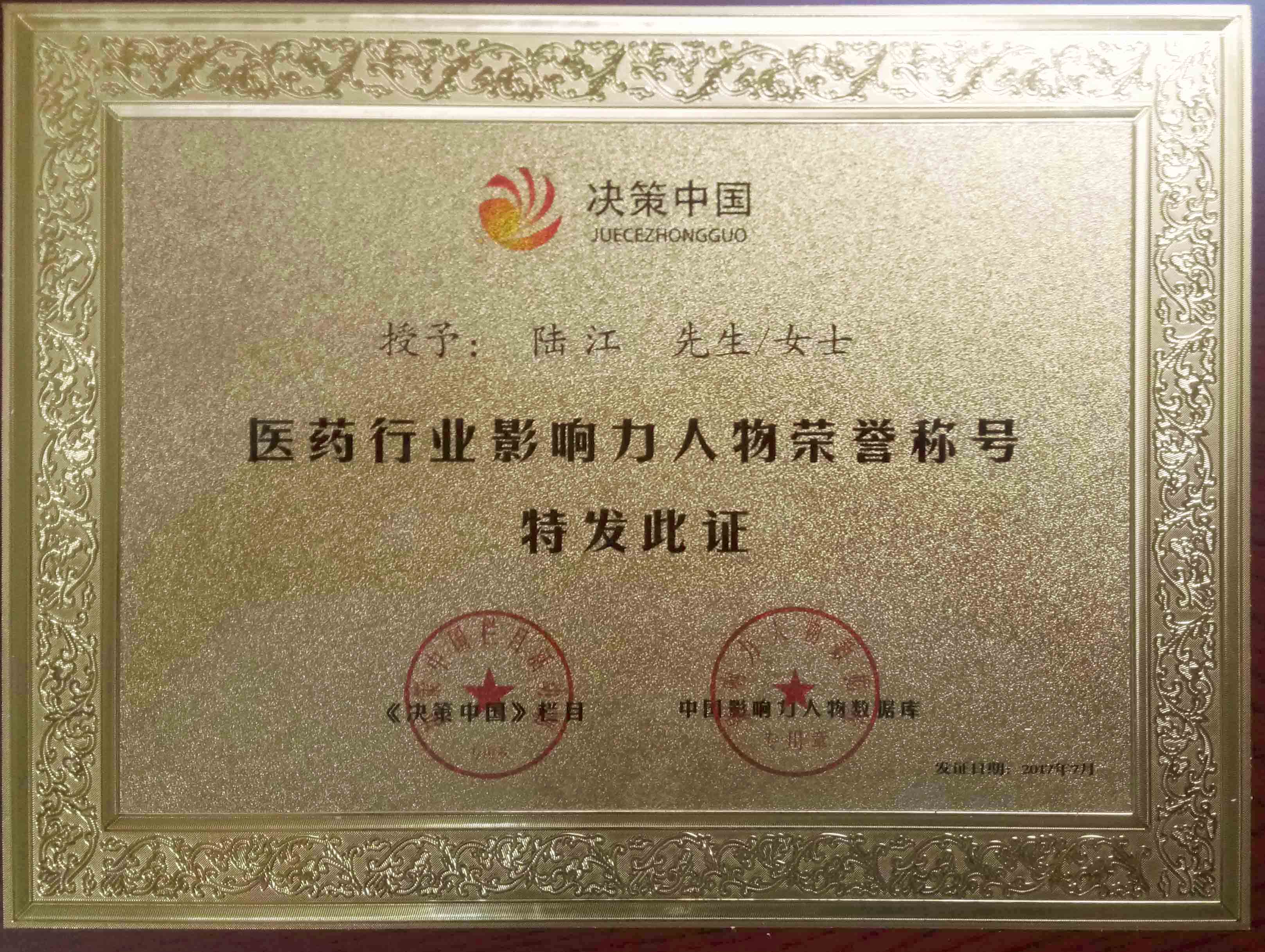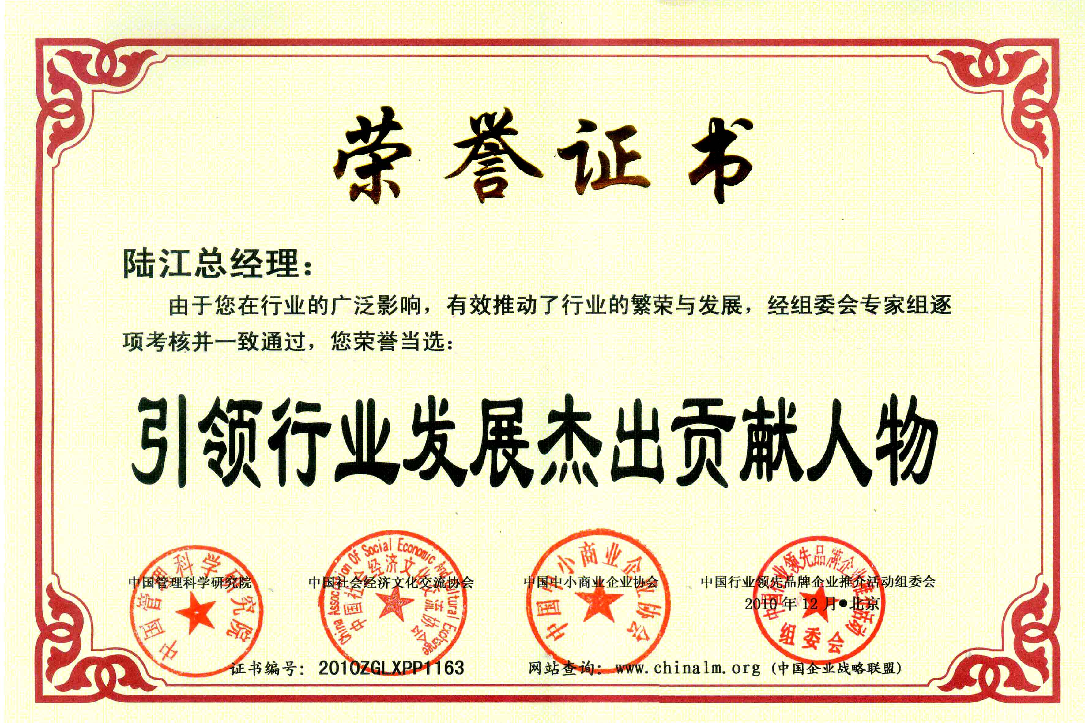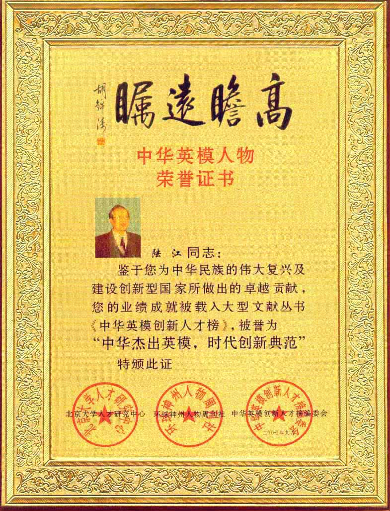 陸江榮獲引領行業(yè)發(fā)展杰出貢獻人物證書 --------卓康公司榮獲全國質量、服務、信譽AAA級品牌證書