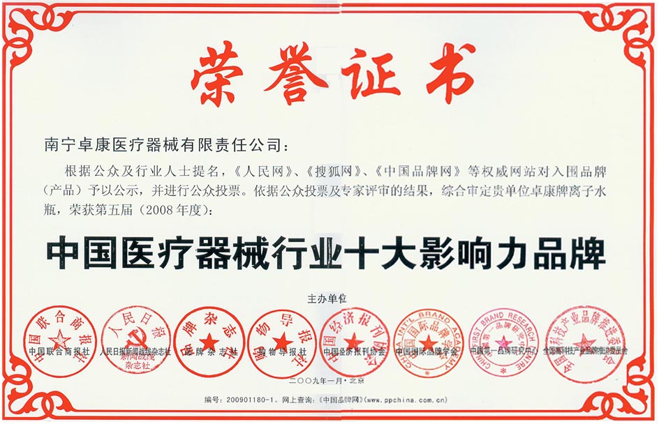 卓康牌離子水瓶榮獲中國名特優(yōu)品牌[點小圖見大圖] *榮獲中國醫(yī)療器械行業(yè)十大影響力品牌[點小圖見大圖]--------