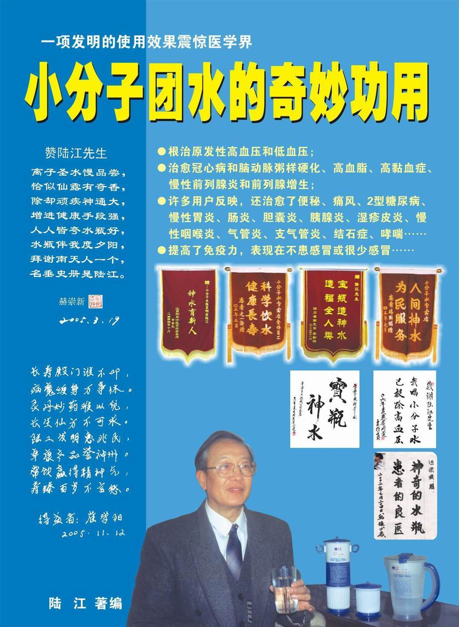 人類幾千年來患以上病癥需終生服藥,幾十年也不能治愈。可是我國南寧的高級工程師陸 江,于1990年想根治高血壓,研究發(fā)明了離子水瓶,處理出微小分子團水供飲用,經(jīng)過醫(yī)院臨床試用和專家鑒定,1999年獲中國發(fā)明專利權,產(chǎn)品于2000年投放市場后一直跟蹤調查,據(jù)全國各地用戶反饋:祛除了高低血壓、糖尿病和冠心病,并使前列腺增生、咽喉炎、鼻竇炎、慢性氣管炎、支氣管炎、矽肺病、哮喘、慢性胃炎、腸炎、慢性膽囊炎、慢性腎炎、腎衰、膀胱炎、便秘、痔瘡、風濕性關節(jié)炎和濕疹皮炎及中風后遺癥等病癥不藥而愈。為什么喝微小水能治20多種病?陸 江從1991年德國科學家發(fā)現(xiàn)細胞膜水通道僅為2納米獲得啟發(fā),認為多種器官患病是因細胞脫水,不能正常代謝和分裂增殖,才使器官細胞減少致衰弱萎縮而形成細胞缺水性病癥。22年來的實踐有力地支持了“細胞脫水致病”這一重要論點,表明喝微小水可滿足細胞的生理需求,補水就能祛病,是生命科學新亮點。
